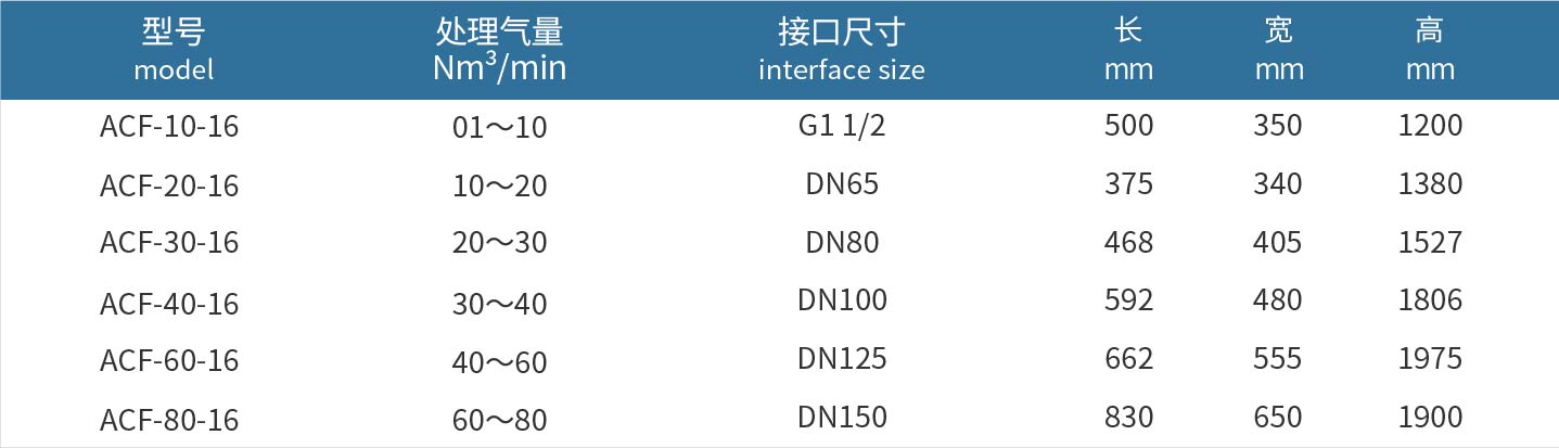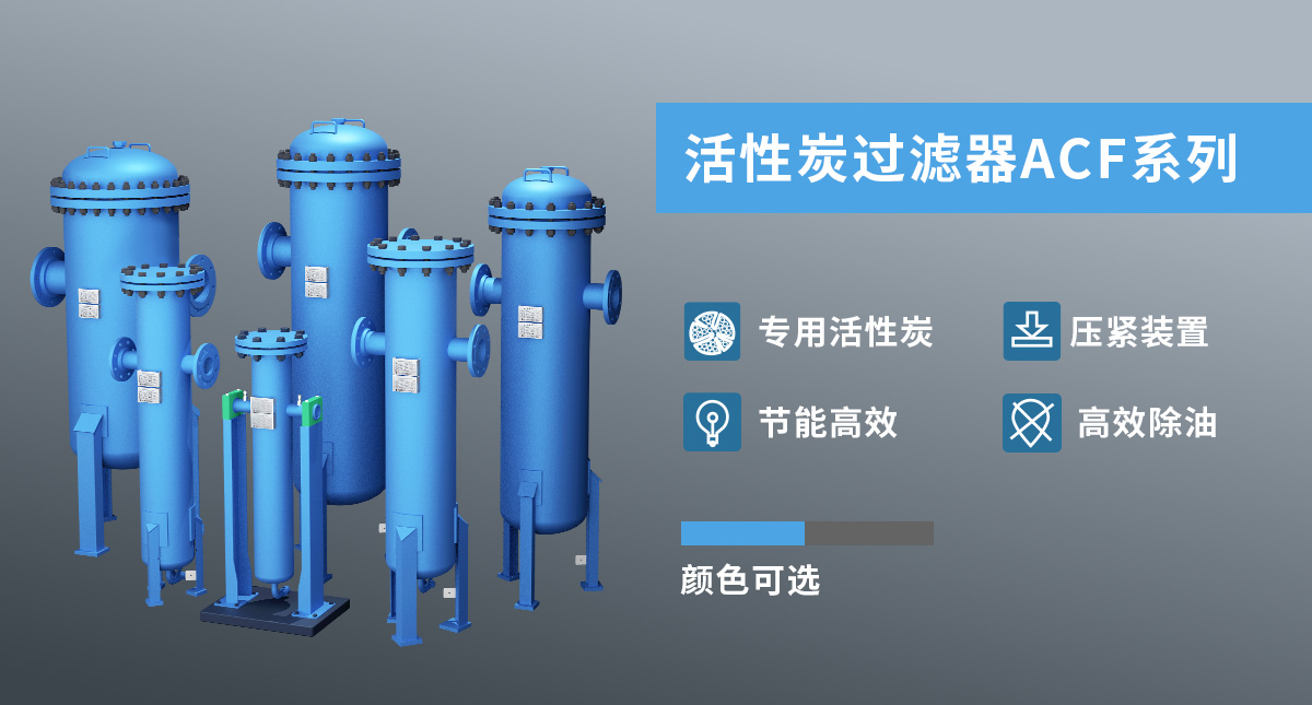活性炭过滤器ACF系列是利用活性炭对油类污染物的强吸附特性进行除油的,以罐体结构装填足量的专用活性炭吸附剂,并通过优化内部管路结构来确保通过罐体填料床层的气流均匀,从而保证产品除油性能。活性炭填料的品质好坏直接影响活性炭过滤器的除油效果,我们采用适用于气体油类污染物脱除的大比表面积活性炭材料,装填量也是普通滤芯式过滤器的百倍甚至千倍,除油效果在设计周期内可确保0级无油。