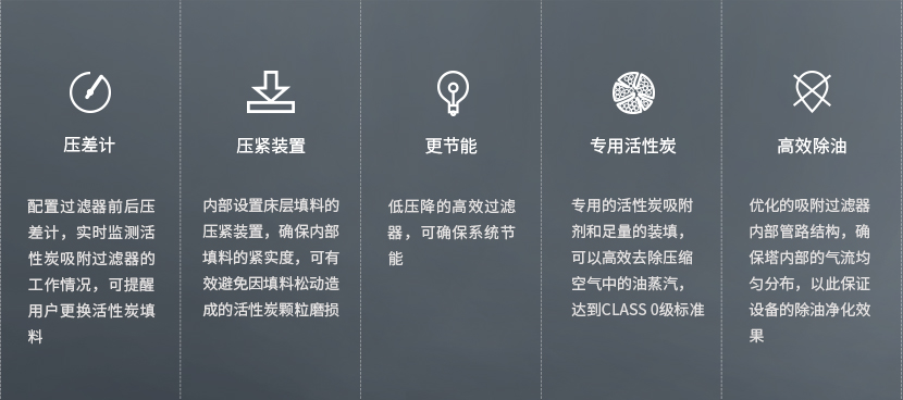 活性炭是一种具有很强吸附能力的非极性吸附剂,其比表面积一般在600~2000 ㎡/g。压缩空气中的油(C6+以上烃类)极性很弱,活性炭对其吸附去除能力很强。活性炭不仅能去除压缩空气中的液态油和悬浮油,也能良好吸附去除油蒸气,处理后压缩空气含油量可达国标1级以上标准。