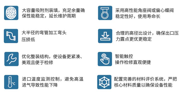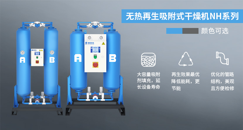 无热再生吸附式干燥机NH系列采用变压吸附原理,无加热及其它辅助装置,结构及工作流程简单,设备结构紧凑,维护保养方便,故障率低;但其工作周期短,阀门切换较为频繁,再生气消耗量相较其他类型吸干机大,多适用于中小气量的压缩空气系统。