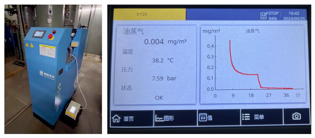 系统投用后,为检测处理压缩空气的品质,通过油蒸汽检测设备对转化式除油机出口油含量进行检测。在客户使用的额定工况下,检测设备出口总含油量低至0.004mg/m³,达到ISO8573.1的0级无油标准。由此从数据上印证了用户实际用气效果,让转化式除油机稳定高效的除油能力进一步得到了用户的高度认可。