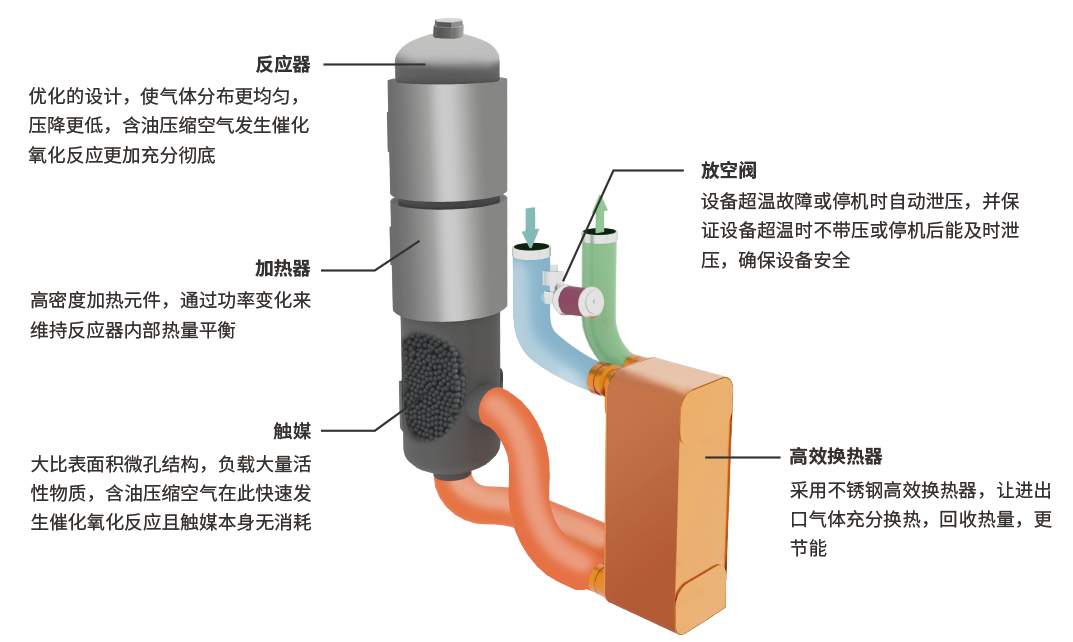 C6及C6+的碳氢化合物彻底转化为CO2和H2O,同时在高温作用下,压缩空气中的生物菌类被杀灭,实现气源的除油杀菌,得到高洁净等级的压缩空气。整个过程通过高精度温度控制,系统自动调节,安全稳定。处理后的压缩空气可稳定达到0级无油标准。