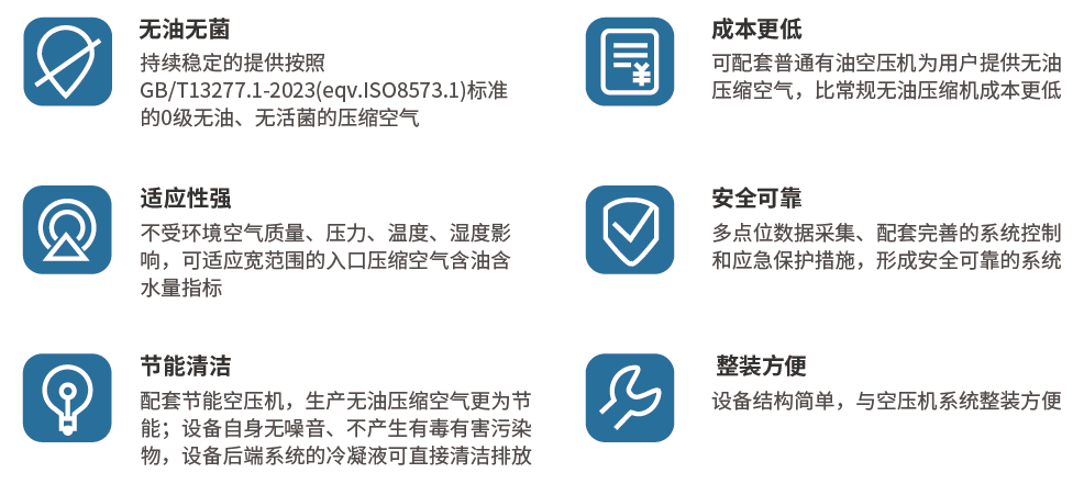 1.转化式除油组件直接集成低压油润滑压缩机系统,成为无油空气压缩机系统,可为用户提供低压无油压缩空气;