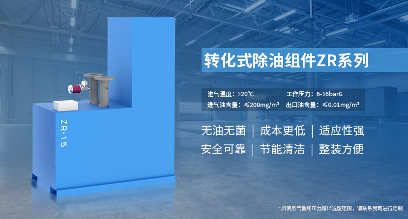 ZR系列除油产品是基于催化氧化技术研发的一款配套集成无油空气压缩机系统的组件式设备,其作为除油净化产品不受环境空气质量、压力、温度、湿度及滤芯等耗材寿命影响,可为客户提供GB/T13277.1-2023(eqv.ISO8573.1)标准要求的最高净化等级0级无油压缩空气。