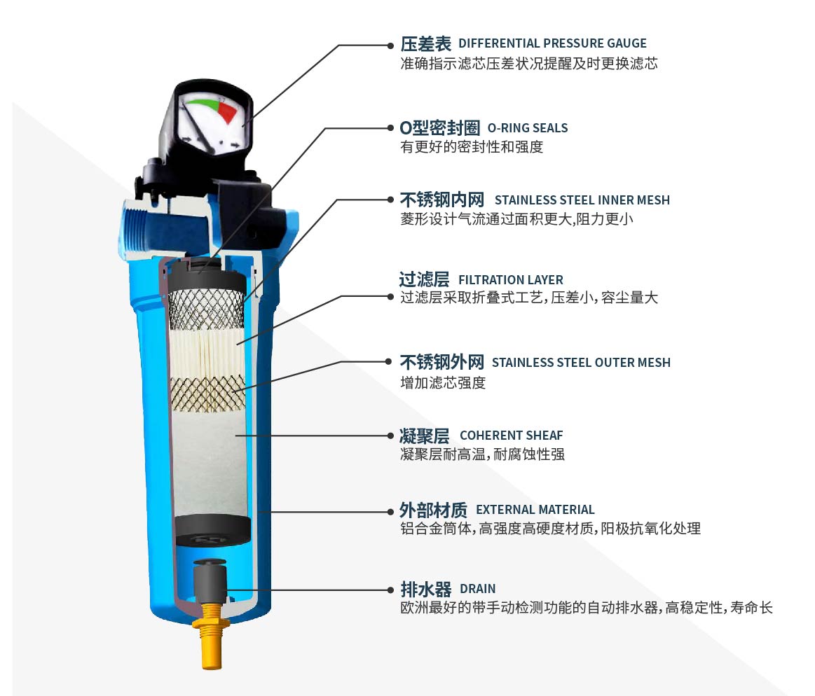 当待处理的压缩空气进入过滤器时,流速放缓,大颗粒的液滴在重力作用下掉落下来,还有一些液滴和固体颗粒在通过玻纤滤料层时被直接拦截下来。较小直径的液滴因惯性碰撞被滤料捕捉并逐渐凝聚成更大的液滴流下和固体颗粒随气流通过滤芯时,更小的固体和液体颗粒不随气流改变方向,只是在做布朗运动,一旦接近滤料时,受玻纤的静电引力影响而被吸附在滤料上。